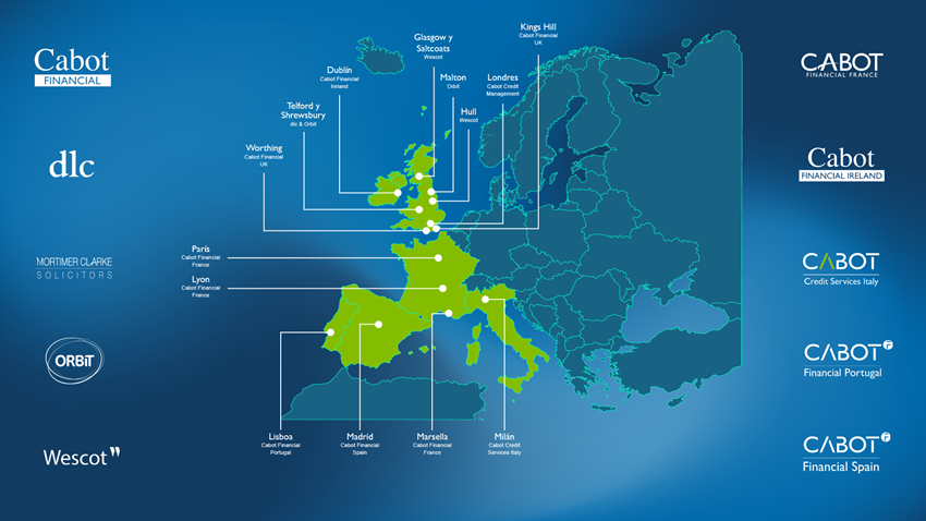 Cabot Credit Management, a través de sus filiales opera en el Reino Unido, España, Portugal, Francia, Irlanda e Italia.